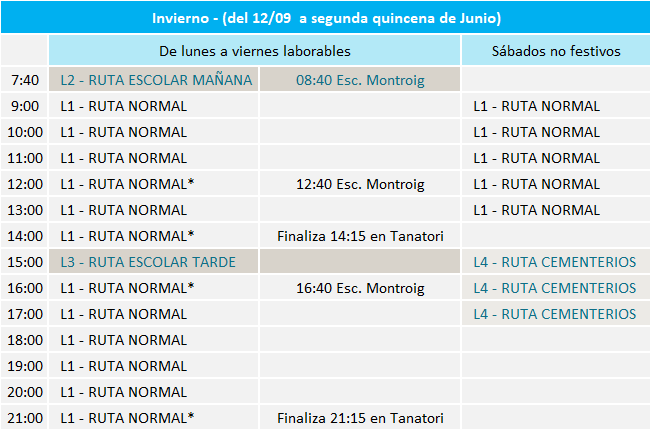 NOTAS: El bus de las 14:00 y de las 20:15 recoge usuarios de las piscinas del Secà y los deja en el centro de Balaguer.