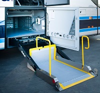 Plataforma elevadora motorizada para facilitar el acceso al autobús de viajeros en silla de ruedas/escúteres. Consulta las características mínimas de sillas y escúteres admitidos en el apartado Plazas especiales .