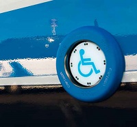 Trama completa de barras y asideros en color de contraste y material antideslizante para facilitar el acceso y abandono del autobús a pasajeros en silla de ruedas o escúteres, discapacidad o movilidad reducida.
