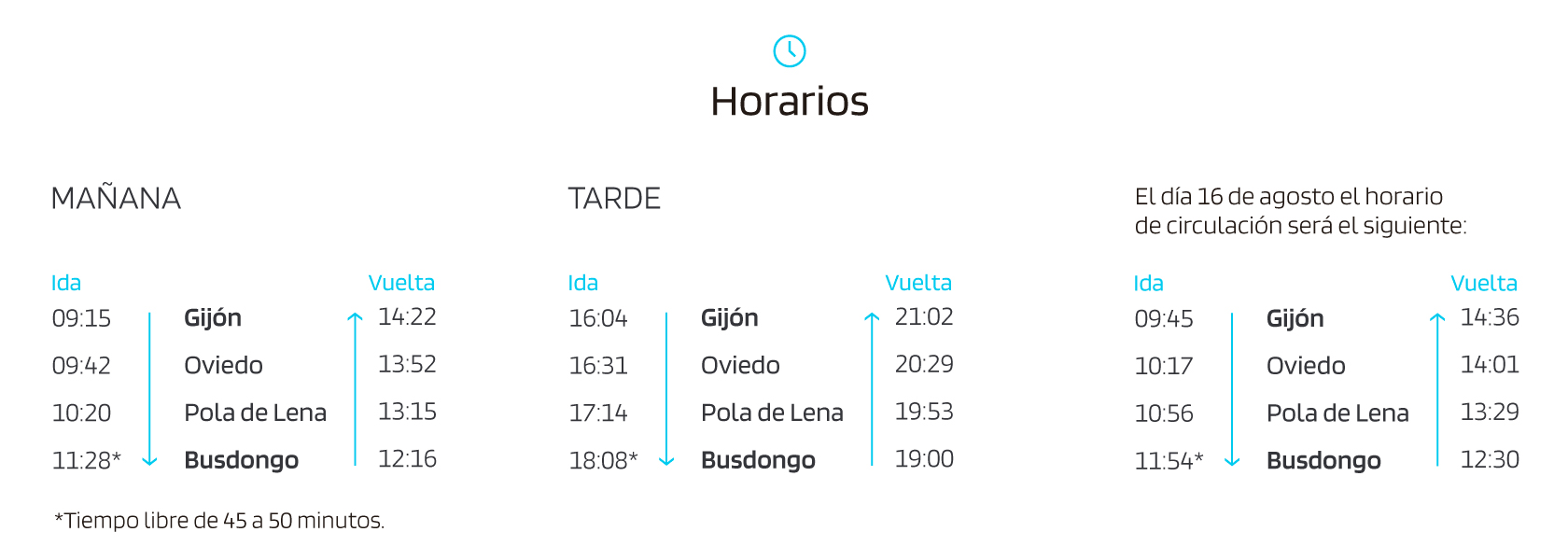 Todas las circulaciones de mañana iniciarán su recorrido a las 09.15h y las circulaciones de tarde, a las 16:04h desde la Estación de Tren de Gijón- Sanz Crespo.