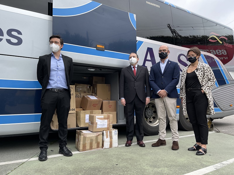 Alsa ha sido el colaborador que transportó el material desde Asturias hasta la capital catalana. El envío partió el jueves 27 de mayo de Oviedo, tras un encuentro realizado entre Humberto R. Solla, vicerrector de Relaciones Institucionales y Coordinación de la Universidad de Oviedo; Rebeca Cerezo, directora de Área de Cooperación, Tercer Sector y Responsabilidad Social y, por parte de Alsa, Javier Martínez Prieto, director zona Cornisa, y Javier de los Ríos, gerente de contrato Asturias.