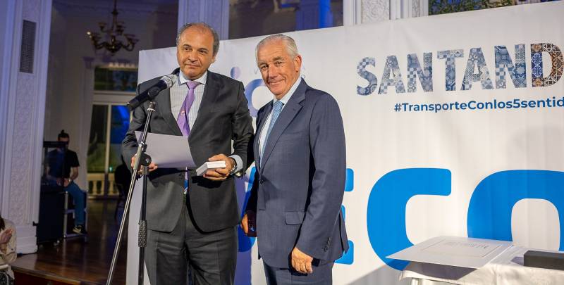 Ignacio Pérez-Carasa, director de Relaciones Institucionales (izda.), y Javier Carbajo, vicepresidente de Alsa, recogen el reconocimiento póstumo a la trayectoria profesional de Juan Antonio Esteban.