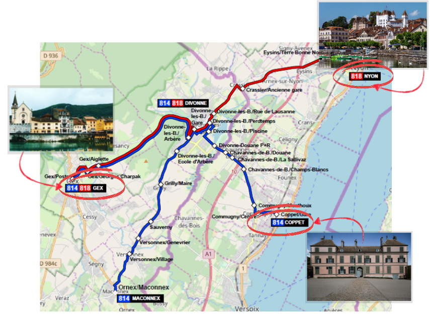 Se trata de dos servicios transfronterizos que conectan el Pays de Gex y las ciudades suizas de Coppet y Nyon, ambas a las orillas del Lago Léman. En concreto, consisten en el rediseño de la línea 814, ya existente, y la creación de una nueva línea, la 818, que se suma a la anterior para mejorar las opciones de movilidad en el área. Hasta ahora este servicio era operado por la empresa pública suiza TPN en consorcio con la empresa pública francesa Régie Départementale des Transports de l'Ain.