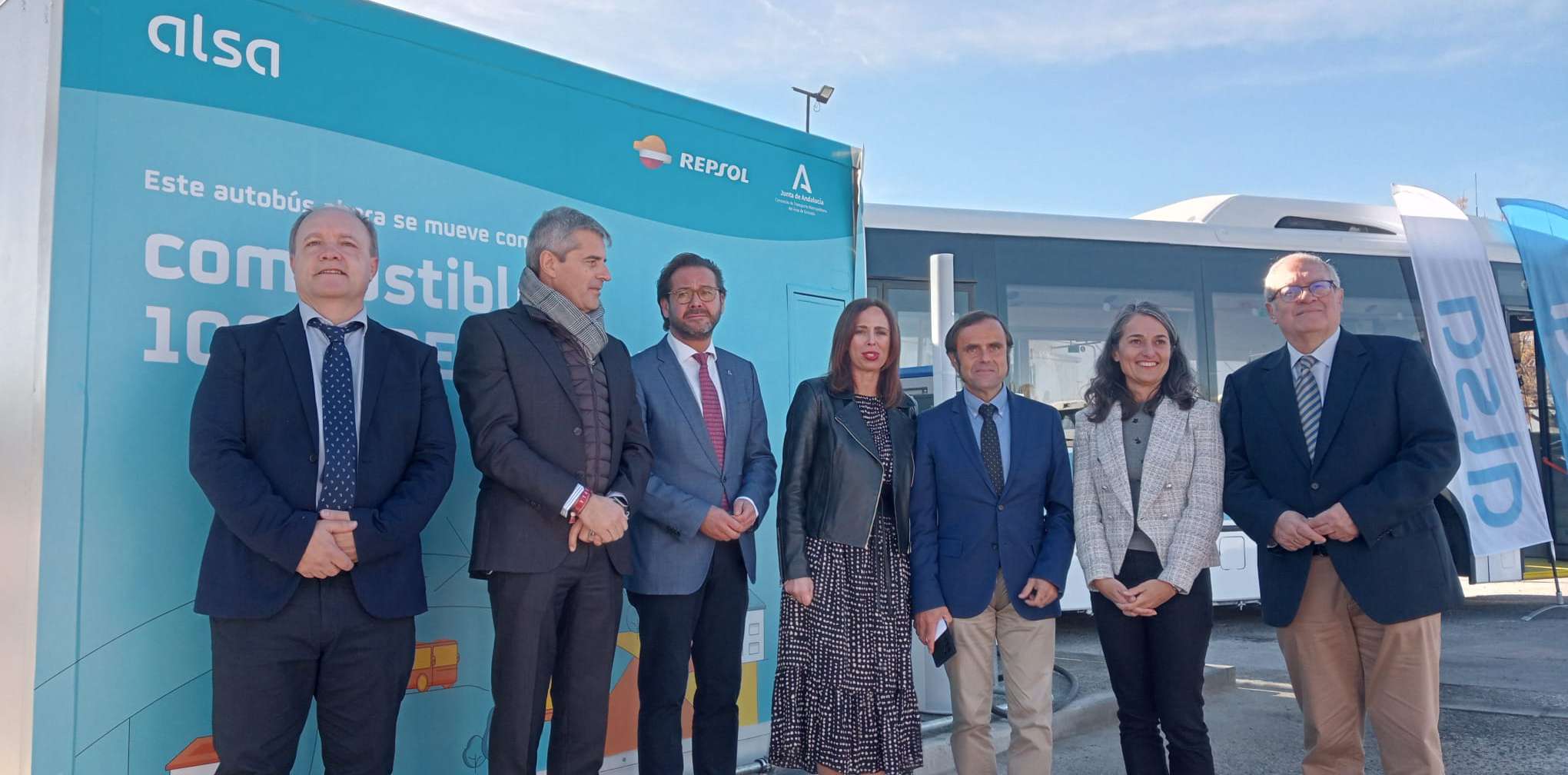 De izquierda a derecha, Manuel García González, Teniente de Alcalde del Ayuntamiento de Maracena; César Díaz, Director Gerente del Consorcio de Transporte Metropolitano del Área de Granada; Antonio Granados, delegado del Gobierno de la Junta de Andalucía en Granada; Rocío Díaz, Presidenta del Consorcio de Transporte Metropolitano del Área de Granada y Consejera de Fomento, Articulación del Territorio y Vivienda del Gobierno de la Junta de Andalucía; Valeriano Díaz, al frente del Área Mediterránea de Alsa; Estíbaliz Pombo, subdirectora de Productos Energéticos de Repsol y Antonio Ayllon, Delegado Territorial de Fomento, Articulación del Territorio y Vivienda en Granada.