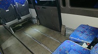 Plataforma elevadora motorizada para facilitar el acceso al autobús de viajeros en silla de ruedas/escúteres. Consulta las características mínimas de sillas y escúteres admitidos en el apartado Plazas especiales .